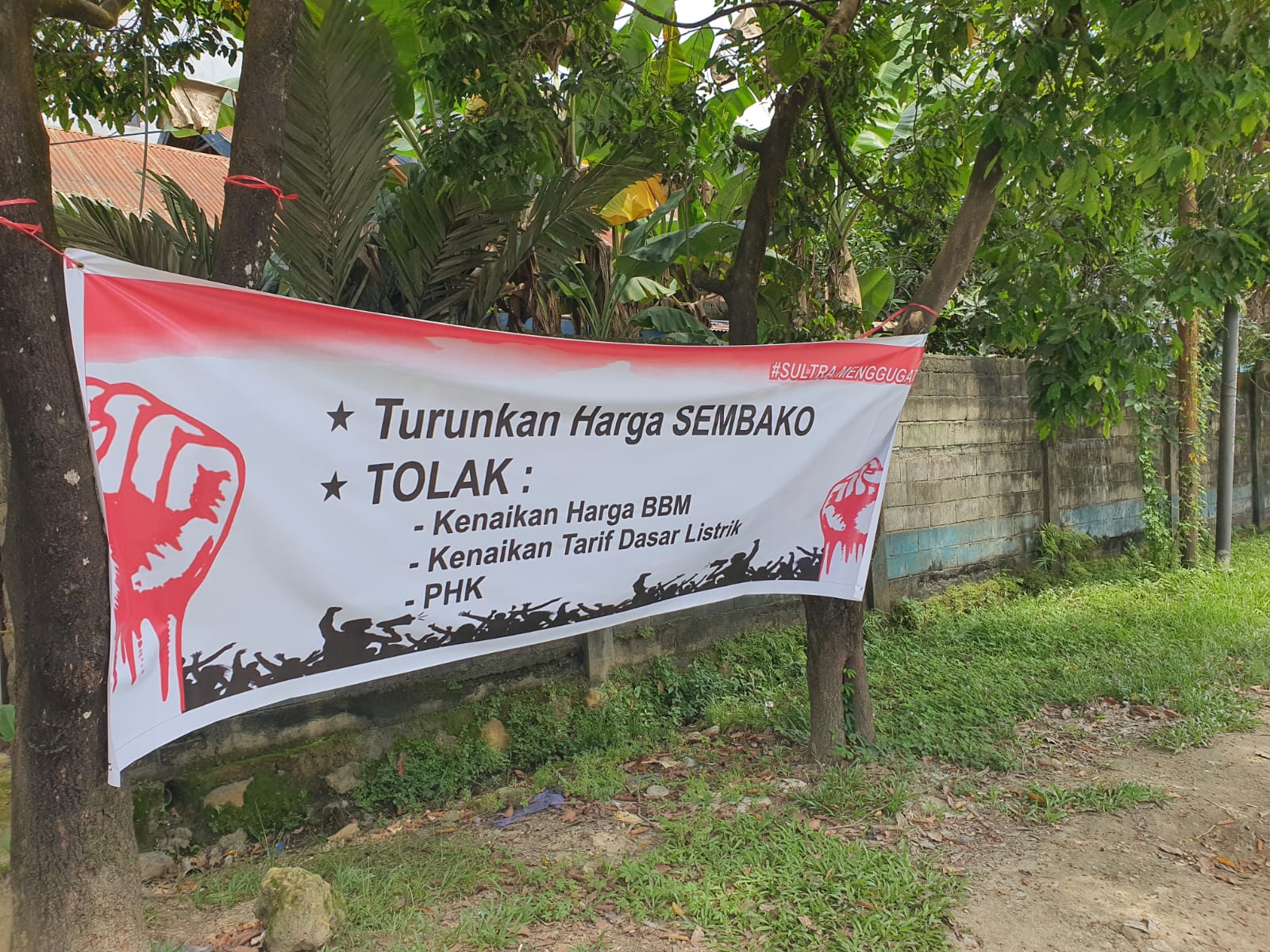 AKSARASULTRA.COM, KENDARI – Sejumlah spanduk bertuliskan ‘Turunkan Harga SEMBAKO, TOLAK : Kenaikan Harga BBM, Kenaikan Tarif Dasar Listrik, dan PHK #Sultramenggugat’ terpasang di beberapa titik di Kota Kendari, Sulawesi Tenggara, Sabtu 20 April 2024.