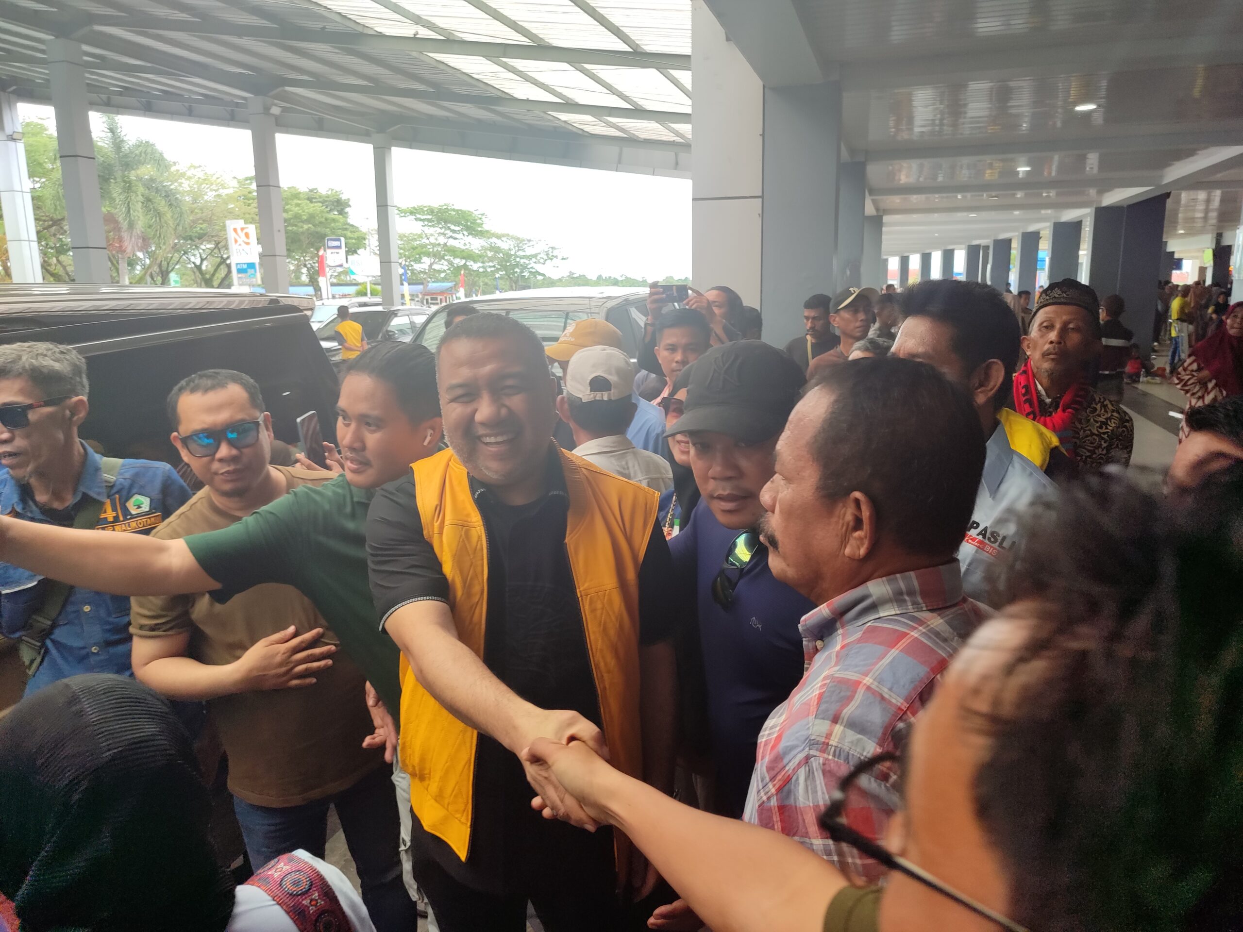 AKSARASULTRA.COM, KENDARI – Ribuan simpatisan jemput kedatangan Bakal Calon (Balon) Wali Kota Kendari, Sulawesi Tenggara (Sultra), Aksan Jaya Putra (AJP) di Bandara Halu Oleo usai mengamankan rekomendasi B1-KWK Partai Golkar, Selasa (27/8/2024).